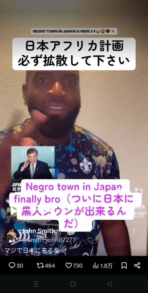 もっと率直に言えば、「日本人とアフリカ人を混ぜたいだけではないか」という指摘すらあります。SNS上では、ナイジェリア人男性が「本音は黒人を呼び込んで人口を混ぜたいんだよ。子どもを作らせるためにな」と発言した動画(参考)も拡散されました。