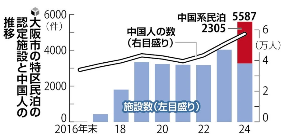 さらに深刻なのは、運営事業者の4割以上が中国人、もしくは中国系法人とみられる点です。中国資本が大阪市内のマンションや一軒家を買い取り、民泊として運営しているケースが増えており、外国人による不動産所有の素地となっているとの指摘もあります。単なる観光ビジネスではなく、土地の囲い込みにつながる懸念を無視できません。